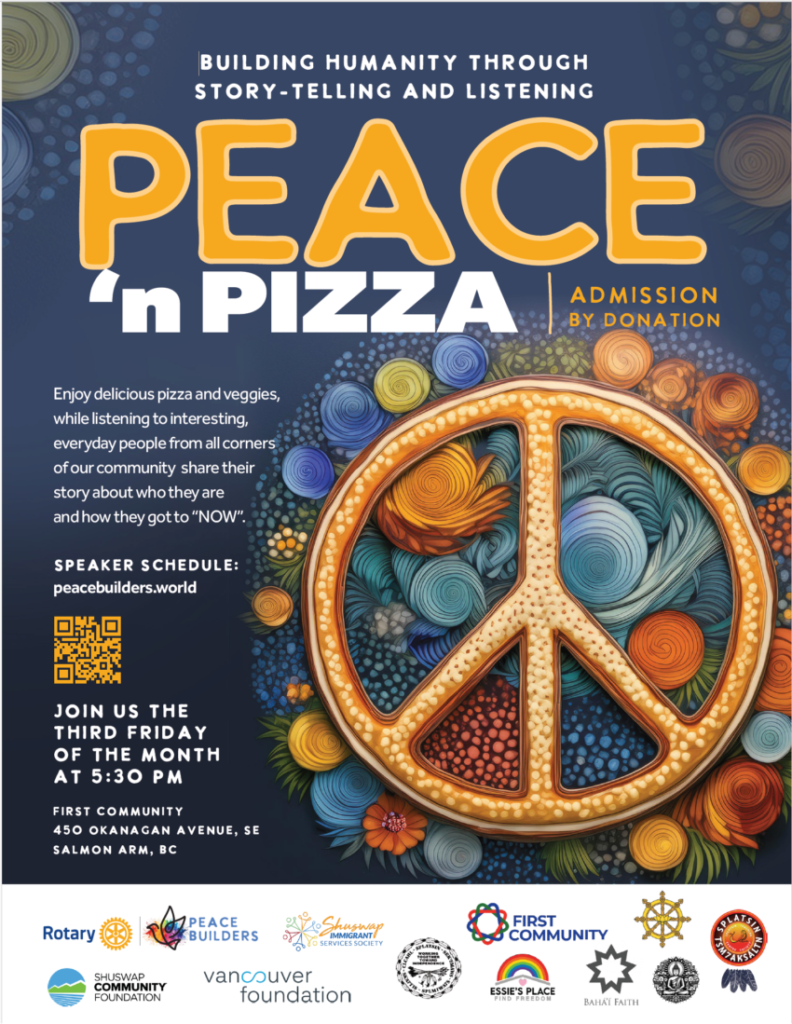 Peace ‘N Pizza is a monthly evening event hosted by First Community and Rotary Peace Builders to hear interesting everyday people’s stories. Structured as a fire-side chat people from all corners of our community will tell their story about who they are and how they got to “Now”.